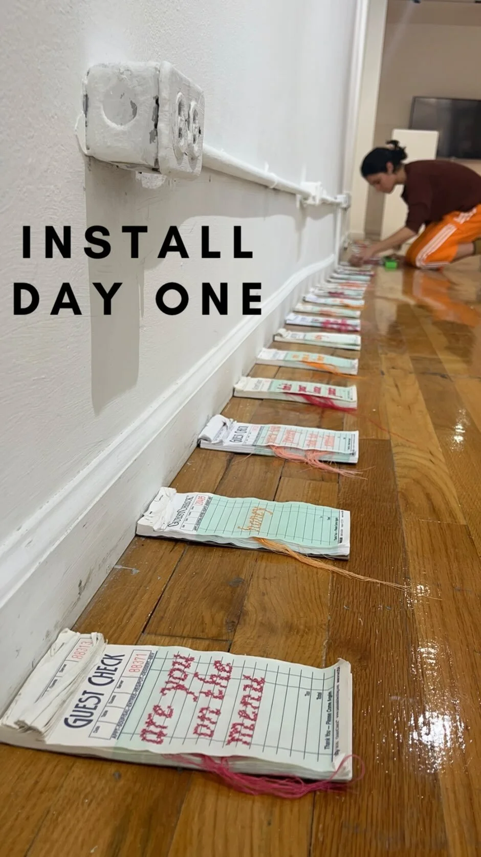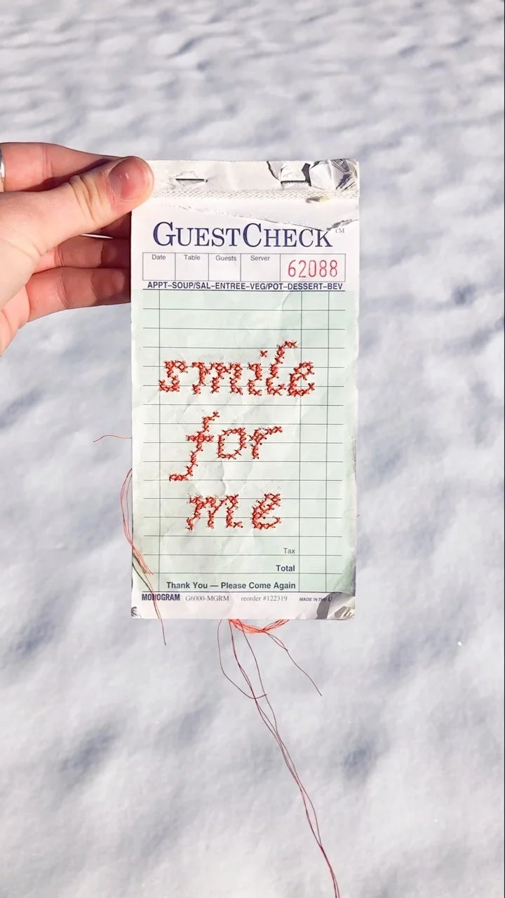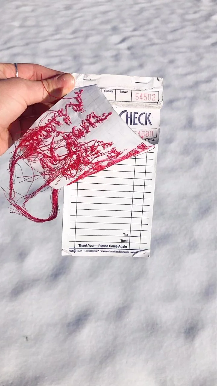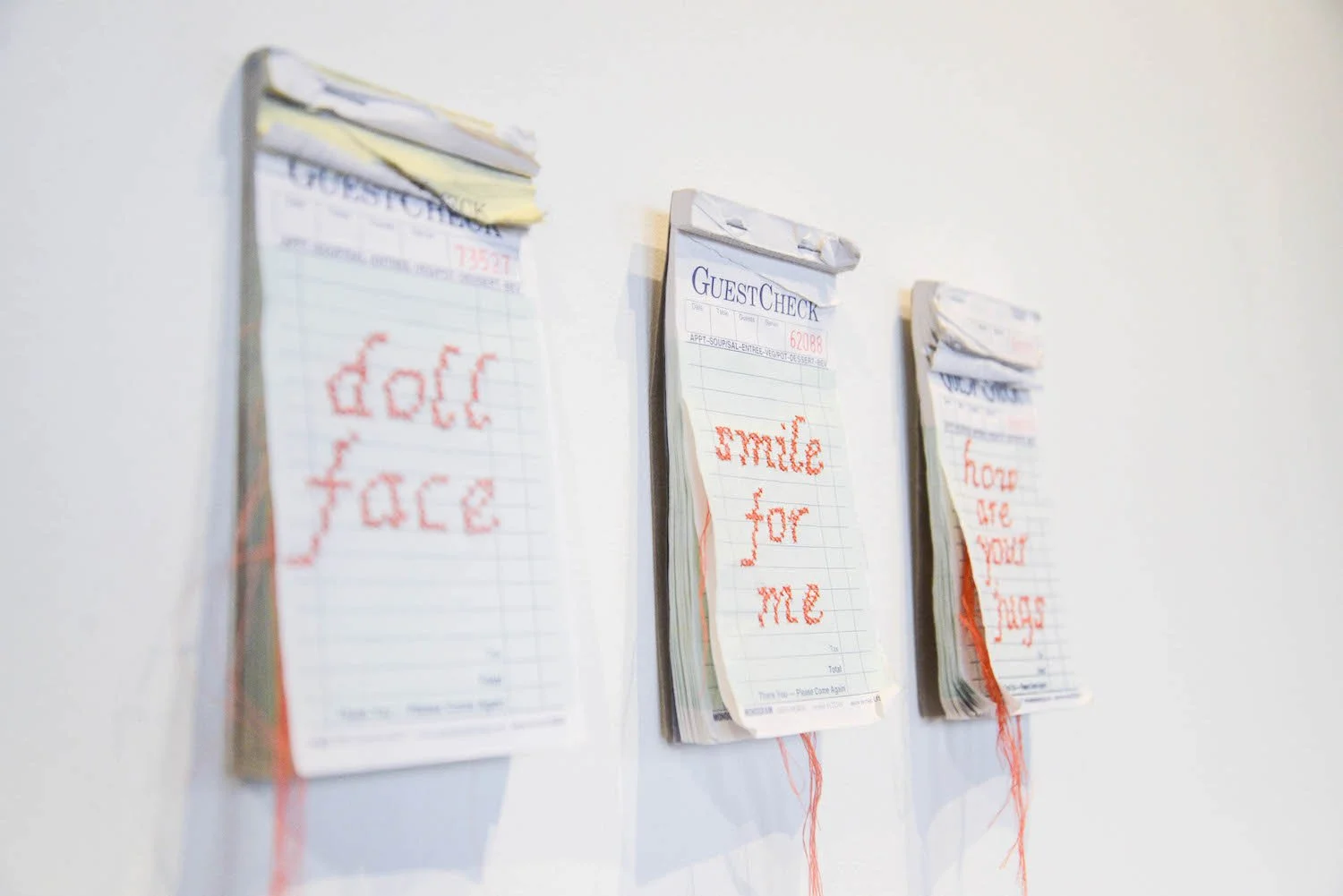 THIS SERIES BREATHES WITH INTENTION. THE GUEST CHECKBOOKS HAVE MADE THEIR WAY INTO MY LIFE AS I UNCONSCIOUSLY BRING THEM HOME, ACCUMULATING THEM OVER THE YEARS OF SERVING AND BARTENDING. THESE NOTEPADS ATTACH THEMSELVES TO MY BODY DURING MY SHIFTS, BECOMING A PART OF ME, WE ARE THE SAME, POSSESSING THE QUALITIES OF FRAGILITY, REFLECTED WITHIN THE SMALL RIPS AND TEARS THAT CAN ONLY BE INSPECTED FROM A CLOSE DISTANCE. THE SHARP POINT OF THE SEWING NEEDLE IS A METAPHOR FOR THE PAIN OF MICROAGGRESSIONS THAT SLOWLY AND UNCONSCIOUSLY REVEALS THEMSELVES AND WORSEN THROUGH REPEATED INFLICTION. JUST AS THE STITCHES IN THESE WORKS ARE PERMANENTLY PUNCTURED, THE WORDS SAID TO ME BY MEN CANNOT BE ERASED OR UNDONE. MY NEEDLE, SEWING THREAD, AND GUEST CHECKBOOK ACT AS TOOLS OF MEDITATIVE RESISTANCE WHILE REFERENCING THE HISTORICALLY ROOTED PRACTICE OF CROSS-STITCHING AND NEEDLEWORK AS “WOMEN’S WORK.” THIS SERIES CONSISTS OF ONE-HUNDRED WORKS THAT INDIVIDUALLY AND COLLECTIVELY QUESTION THE PATRIARCHAL DOMINATED SOCIETY WE LIVE IN WHILE ACTING AS A FORCE OF BOTH PERSONAL RELEASE AND OWNERSHIP OF MY FEMALE FORM.
