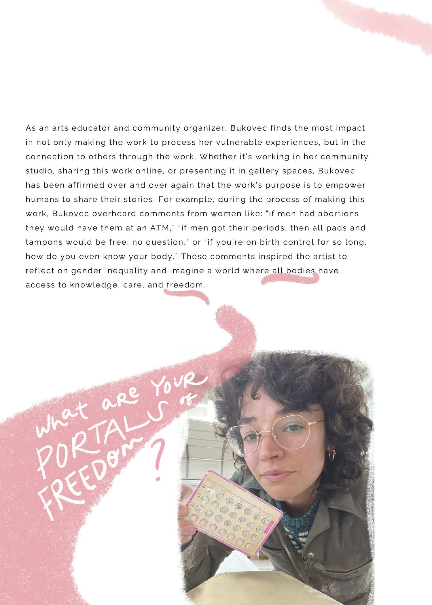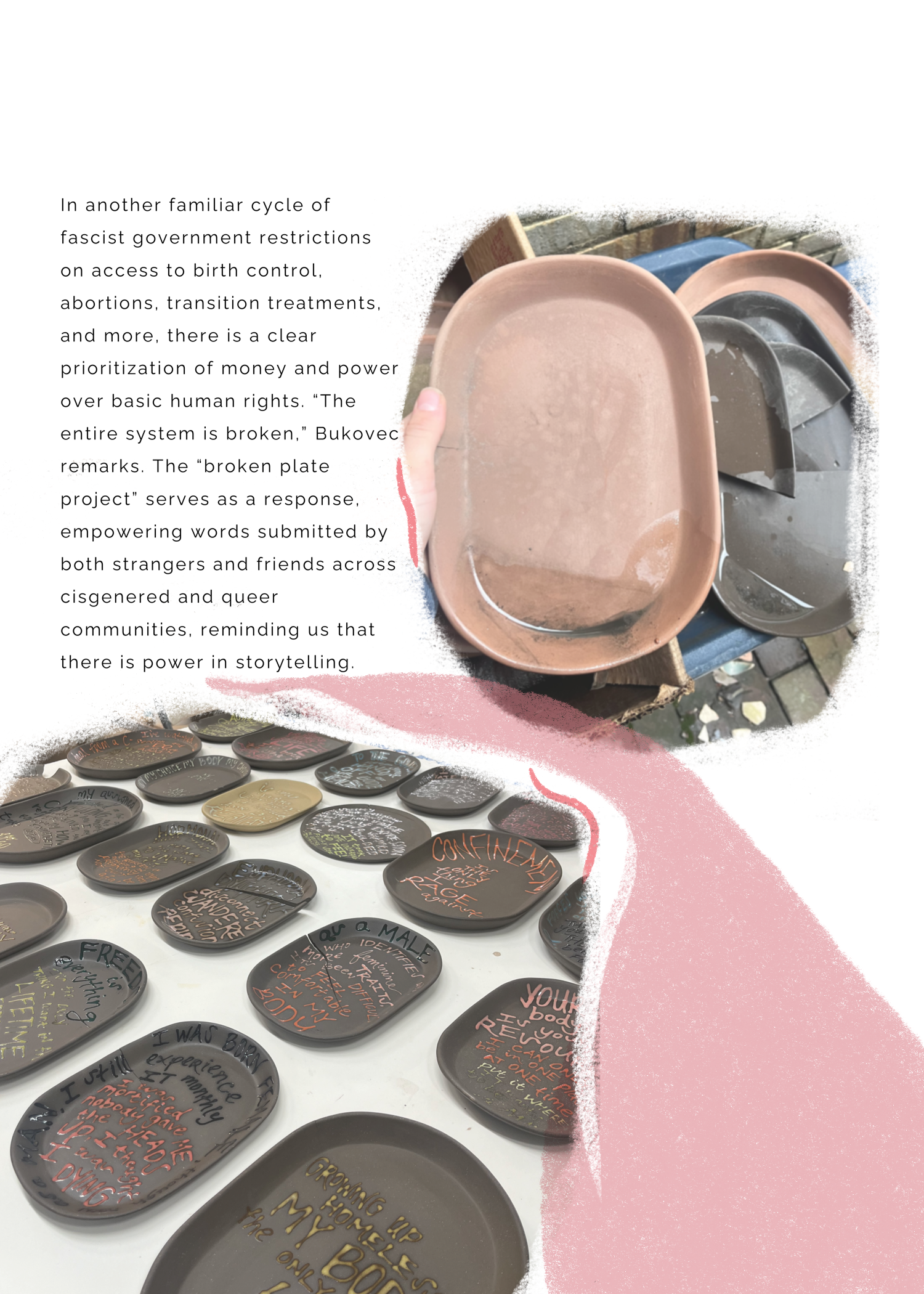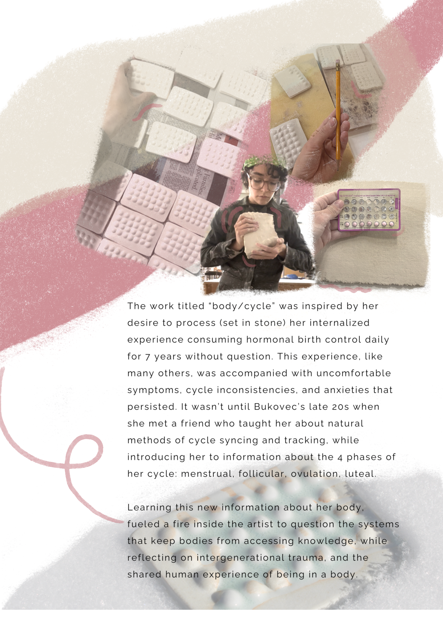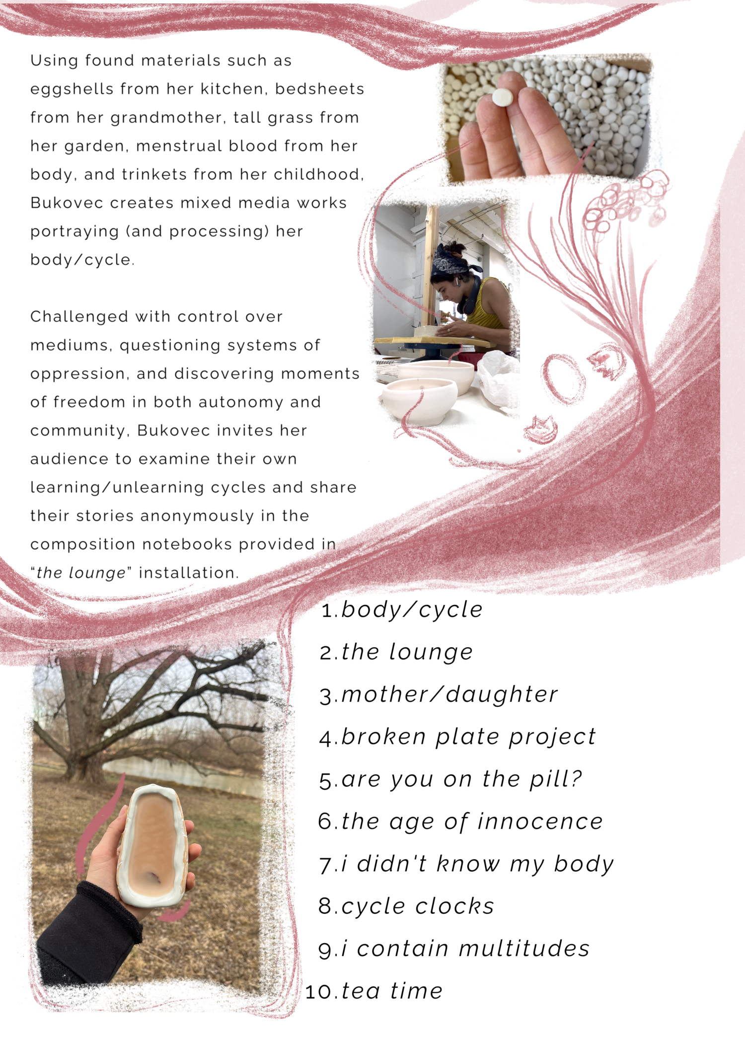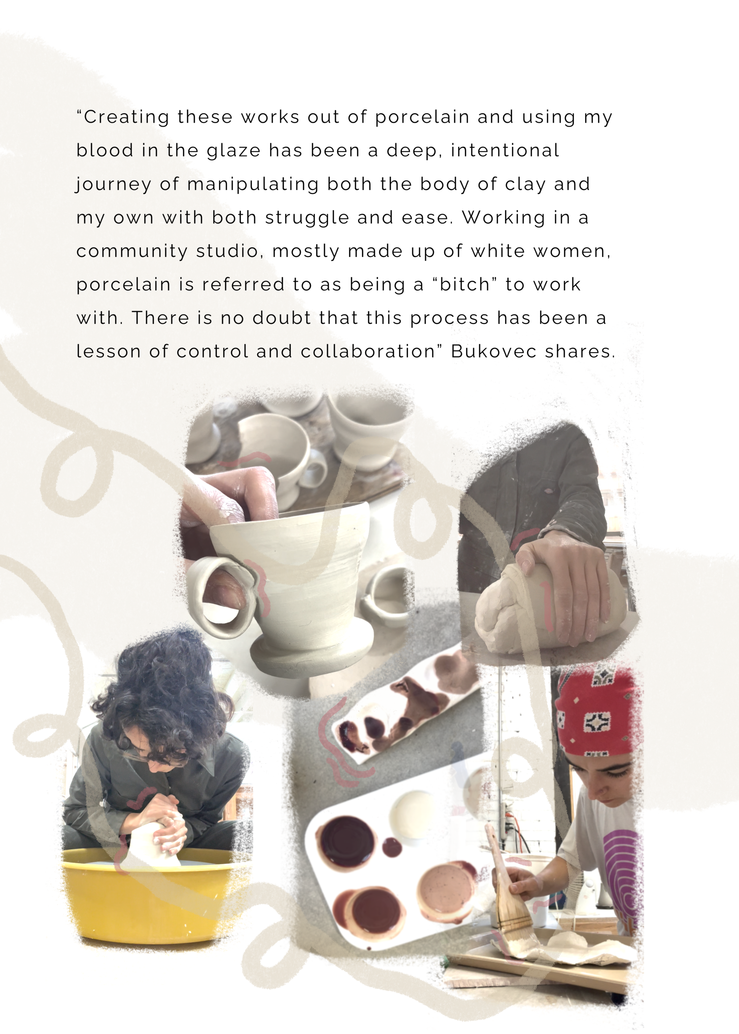 USING A COMBINATION OF CARVING, WEAVING, CROCHETING, STITCHING, ARRANGING, PERFORMING, WHEEL THROWING, HAND BUILDING AND LETTERING, BUKOVEC’S ART SERVES AS A PORTAL TO ENTER INTO HER REALITY OF LEARNING/UNLEARNING ABOUT HER BODY/CYCLE, QUESTIONING THE SYSTEMS OF OPPRESSION, AND DISCOVERING FREEDOM IN BOTH AUTONOMY AND COMMUNITY.